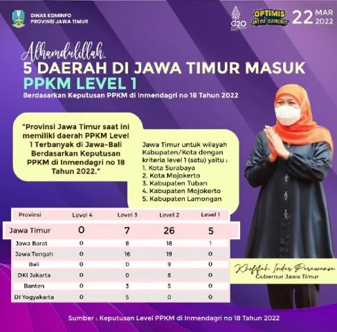 BACA JUGA: Lima Daerah di Jatim Telah Masuk PPKM Level 1, Terbanyak se-Jawa-Bali