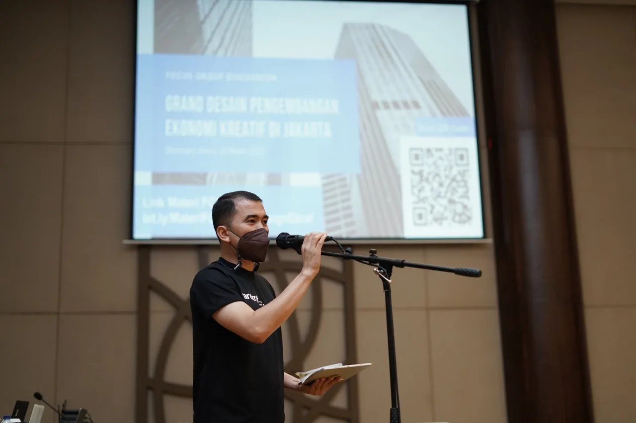 Kegiatan FGD ini menghadirkan sejumlah narasumber, yakni Dini Oktaviyanti (Koordinator Kajian Strategis Kemenparekraf RI), Tulus (Kepala Pusat Inovasi Pengembangan Perkotaan), Diaz Hendrassukma (Ketua umum Komite Ekraf Jakarta), Robby Wahyudi (Program Director Katapel id), dan dipandu oleh Moderator Camelia Harahap (Head of Art and Creative Industries British Council Indonesia) dan Novrizal Pratama (Ketua Umum Yayasan Indonesia Kuat). Kegiatan ini dihadiri juga oleh jajaran di lingkungan Pemprov DKI Jakarta, seperti Badan Perencanaan Pembangunan Daerah (Bappeda) Provinsi DKI Jakarta, Dinas Perindustrian, Perdagangan, Koperasi, Usaha Kecil dan Menengah (DPPKUM) Provinsi DKI Jakarta, Dinas Bina Marga Provinsi DKI Jakarta, Dinas Pertamanan dan Hutan Kota Provinsi DKI Jakarta, dan Biro Perekonomian dan Keuangan Setda Provinsi DKI Jakarta. Selain itu, asosiasi, komunitas, pelaku Ekraf yang mewakili 17 subsektor Ekraf dan akademisi turut hadir.