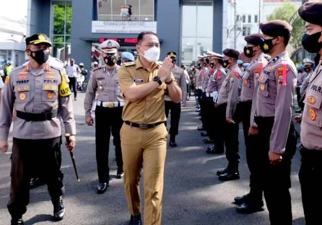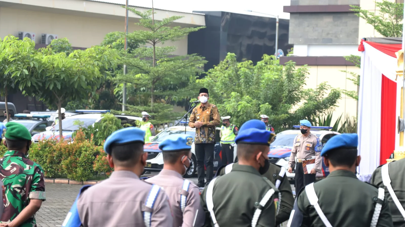 SIDOARJO-KEMPALAN: Bupati Sidoarjo Ahmad Muhdlor Ali memimpin apel gelar pasukan Operasi Ketupat Semeru 2022, di Mapolresta Sidoarjo, Jumat (22/4/2022), yang diikuti personel dari Polri, Kodim 0816 Sidoarjo, Dinas Perhubungan dan Satpol PP.