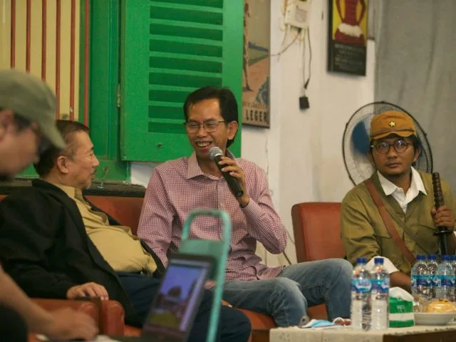 SURABAYA-KEMPALAN: Komunitas penggiat sejarah, Begandring Soerabaia, menggelar ngobrol gayeng alias cangkrukan yang membahas Bung Karno lahir di Surabaya, Sabtu (4/6/2022), di Kafe Lodji Besar, kawasan Jalan Peneleh.