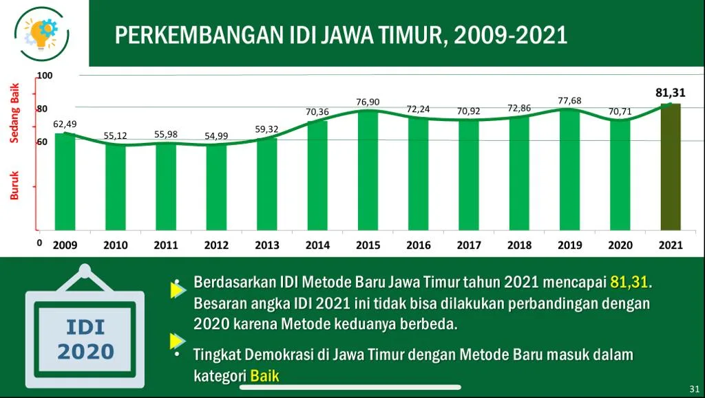 Dari data Indeks Demokrasi Indonesia (IDI) yang dirilis BPS tersebut, disampaikan bahwa nilai Indeks Demokrasi untuk Provinsi Jawa Timur mencapai 81,31 poin. Sementara pada tahun 2020 tercarat 70,71.