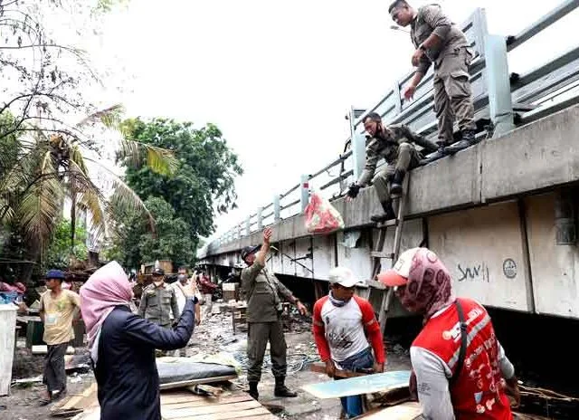 SURABAYA-KEMPALAN: Pemkot Surabaya melalui Dinas Sosial (Dinsos) melakukan pembersihan bawah kolong Jembatan Tol Dupak, Kampung 1001 Malam, di Kecamatan Krembangan, Selasa (18/10). Pembersihan itu dilakukan setelah 16 Kepala Keluarga (KK) yang tinggal di bawah kolong jembatan, kawasan Kampung 1001 Malam, dipindahkan ke rumah susun sewa sederhana (Rusunawa) Sumur Welut.