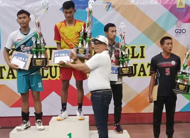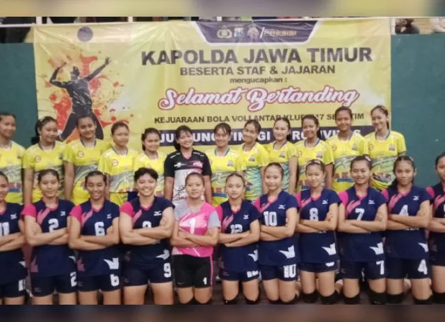 SIDOARJO-KEMPALAN: Tim bola voli Bina Bola Voli (BBV) Surabaya dan Putri Angkasa Tulung Agung tampil sebagai juara pertama dalam kejurprov voli antar klub U17 Pengprov PBVSI Jatim 2022. Final yang di langsungkan di GOR Serba guna Sidoarjo pada Sabtu malam (29/10) mereka mengalahkan lawan-lawannya.