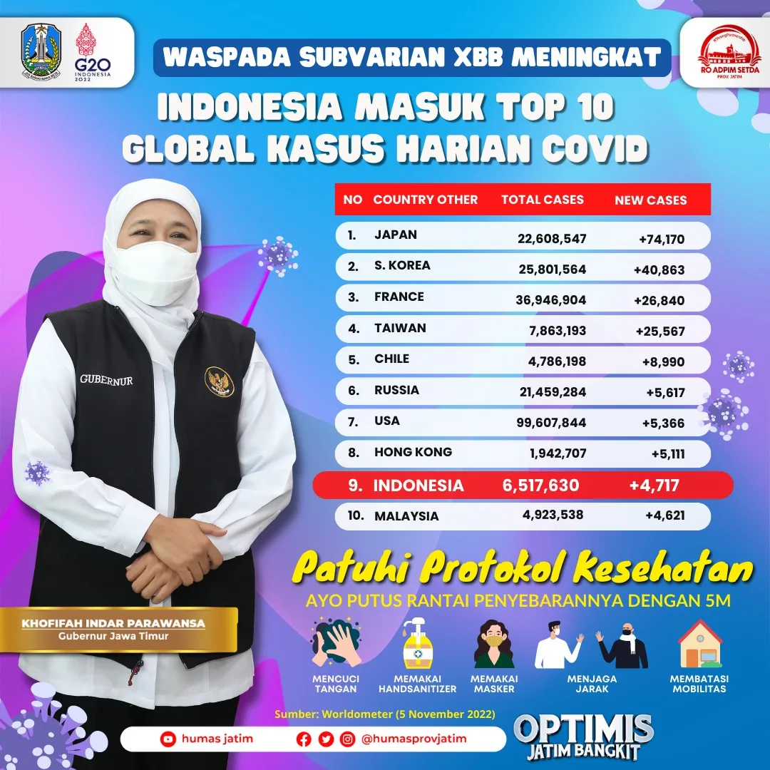 Bukan tanpa alasan, arahan tersebut disampaikan Gubernur Khofifah mengingat terjadinya peningkatkan kasus konfirmasi positif Covid-19 di wilayah Jawa Timur dalam kurun waktu empat hari terakhir. Hal ini juga terjadi secara nasional. Bahkan menurut data worldometer pertanggal 5 November 2022 Indonesia masuk nomor 9 secara global.