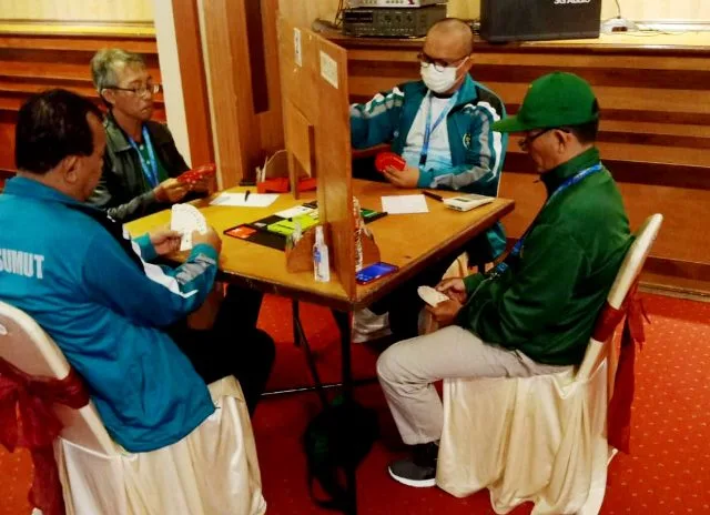 BATU-KEMPALAN: Tampil dengan pemain pelapis, kontingen Jatim gagal mempersembahkan medali cabor Bridge nomor beregu pada Selasa 22/11/2022 di Spencer Hotel kota Batu. Dua pasangan yang tampil di nomor beregu yakni Wawan Triyanto- Yohanes Herry Susetyo/ Ambari Taufiq – Sugeng Purnomo hanya masuk 10 besar. Jatim sebenarnya bisa bersaing untuk meraih medali di nomor beregu ini seandainya tampil dengan kekuatan penuh.
