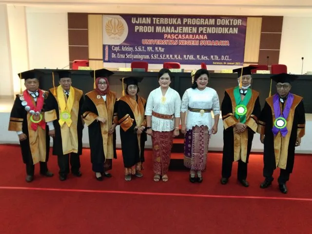 SURABAYA-KEMPALAN: Dr Erna Setiyaningrum SST, S.E.M.M, MA, M.PdK, M.Kes, M.Th. D.C.L resmi menyandang gelar Doktor dalam bidang Manajemen Pendidikan Fakultas Ilmu Pendidikan Universitas Negeri Surabaya (Unesa).