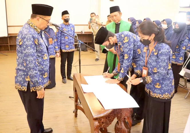 GRESIK-KEMPALAN: Sekretaris Daerah (Sekda) Kabupaten Gresik, Ir. H. Achmad Washil Miftahul Rachman, MT mengambil sumpah jabatan 26 Pegawai Negeri Sipil (PNS).