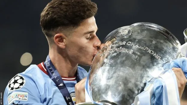 Alvarez adalah pemain Argentina pertama yang menjuarai Treble Winners di level klub bersama Manchester City. Setelah memenangi Liga Primer Inggris dan Piala FA, Minggu (11/6) City memenangi Liga Champions.
