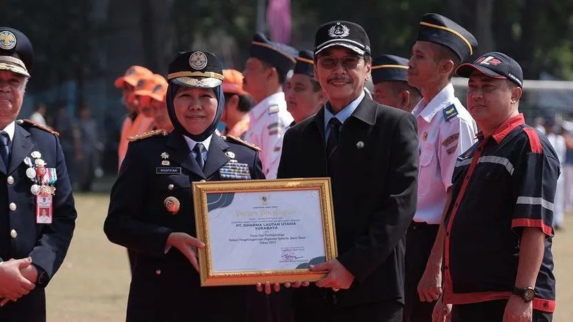 Surabaya – Gubernur Jawa Timur Khofifah IP memberikan penghargaan kepada PT. Dharma Lautan Utama, karena telah berjasa dalam angkutan lebaran tahun 2023.