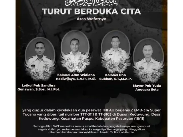 “Innalillahi wa inna ilaihi roji’uun, atas nama pribadi dan Pemprov Jawa Timur kami menyampaikan duka cita sedalam-dalamnya atas terjadinya musibah ini. Utamanya, kepada keluarga korban kecelakaan dua peswat TNI Ini,” kata Khofifah di Gedung Grahadi Surabaya, Jumat (17/11).