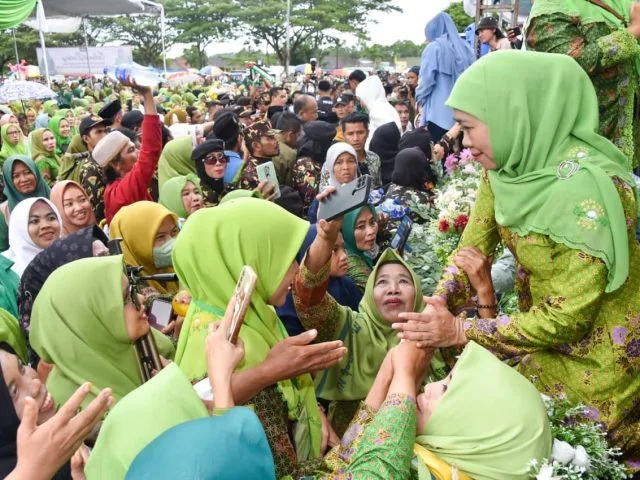 LAMPUNG SELATAN-KEMPALAN: Ketua Umum PP Muslimat NU Khofifah Indar Parawansa menghadiri Pengajian Akbar yang diselenggarakan oleh PW Muslimat NU Lampung di Lapangan Cipta Karya Kalianda, Kabupaten Lampung Selatan, Jumat (12/1).