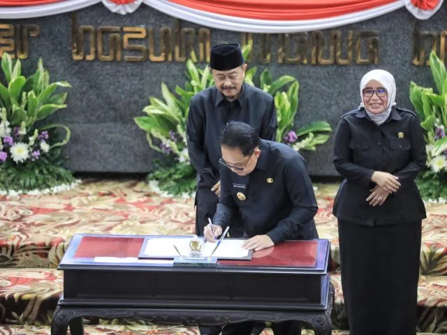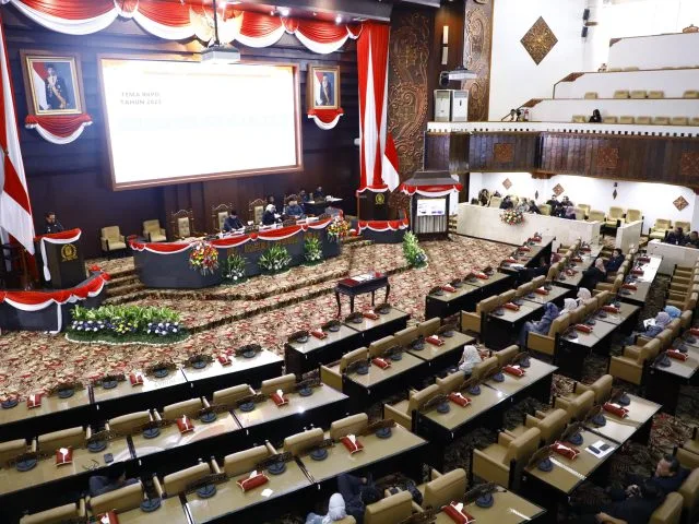 SURABAYA-KEMPALAN: Penjabat (Pj) Gubernur Jawa Timur Adhy Karyono menyampaikan Laporan Keterangan Pertanggungjawaban (LKPJ) Akhir Tahun Anggaran 2023 di hadapan anggota dan pimpinan DPRD Jatim di Jl. Indrapura, Surabaya, Senin (25/3).