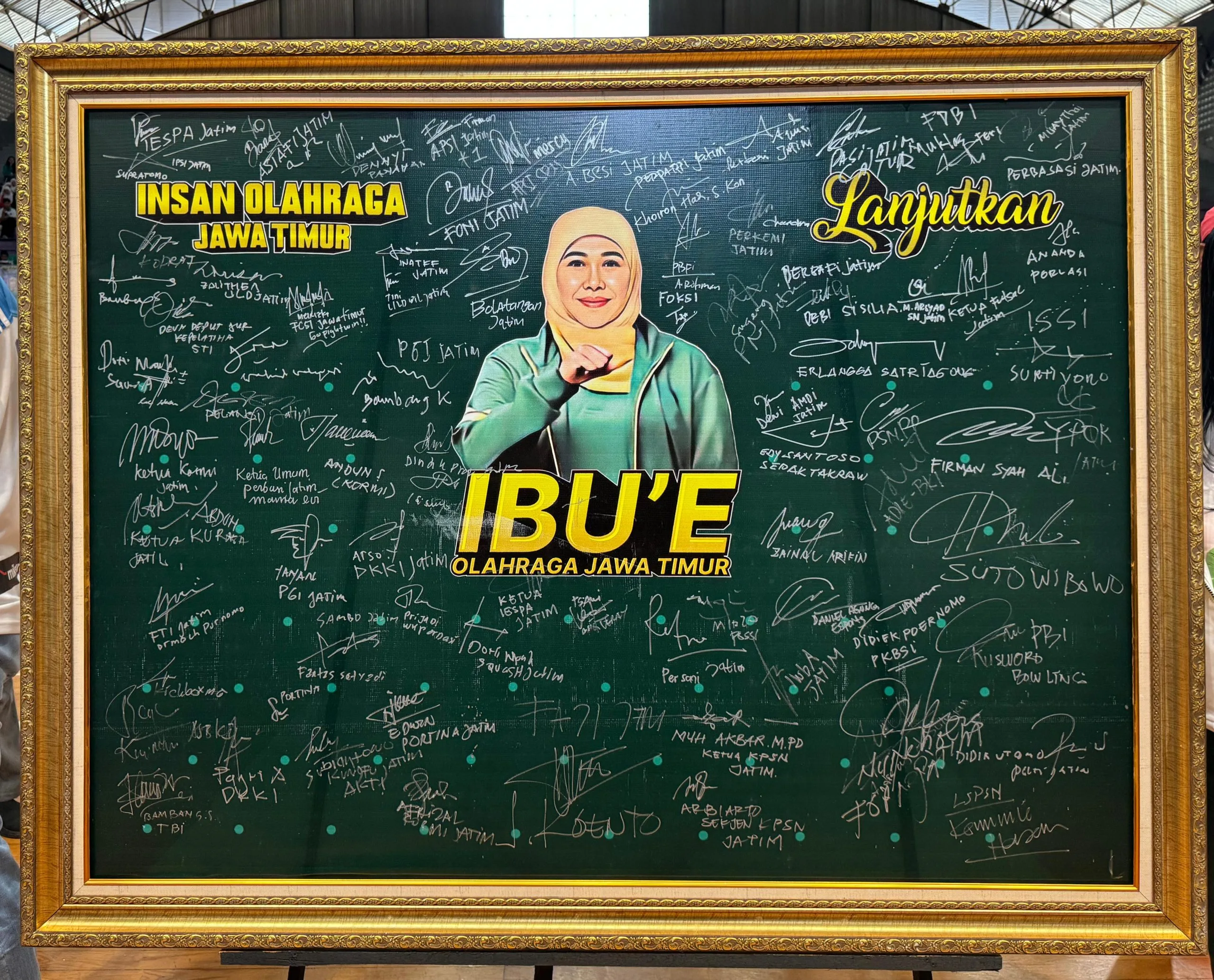 Selain diwarnai bubuhan tanda tangan dari seluruh insan olahraga Jatim. Di kanvas tersebut juga tertulis kata “Lanjutkan!”. Yang menjadi suara harapan para insan olahraga Jatim agar Khofifah kembali memimpin Jawa Timur.