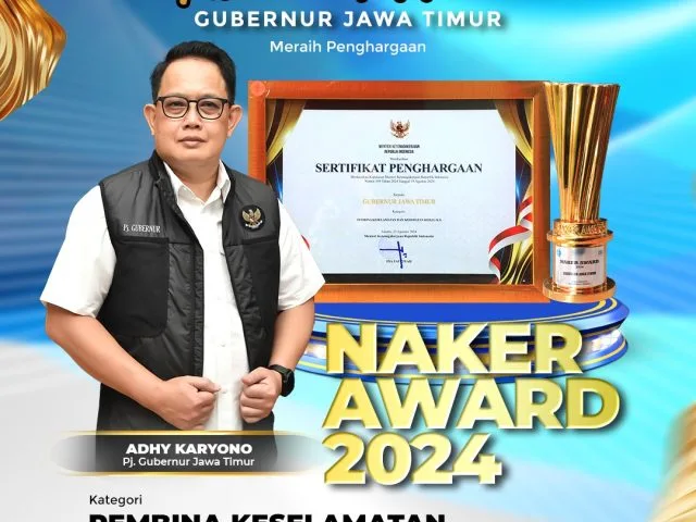 SURABAYA-KEMPALAN: Penjabat (Pj) Gubernur Jawa Timur Adhy Karyono meraih penghargaan Pembina Keselamatan dan Kesehatan Kerja (K3) Terbaik Nasional Tahun 2024 dari Kementerian Ketenagakerjaan (Kemnaker) RI. Penghargaan tersebut merupakan yang keenam kalinya bagi Gubernur Jatim.