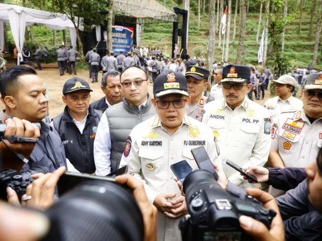 MALANG-KEMPALAN: Penjabat (Pj) Gubernur Jawa Timur Adhy Karyono memimpin apel penutupan Jambore Satuan Perlindungan Masyarakat (Satlinmas) Mendukung Pilkada Serentak 2024 di Bumi Perkemahan Bedengan, Desa Selorejo Kecamatan Dau Kabupaten Malang, Kamis (31/10).