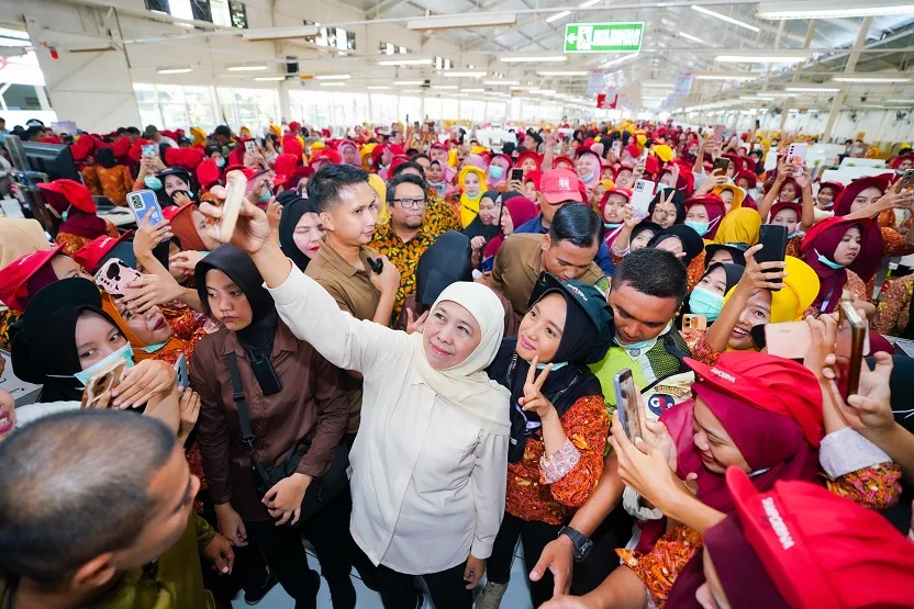 Para pekerja begitu bersemangat menyambut Khofifah, berharap bisa bersalaman, berpelukan dan juga berfoto dengan wanita yang dijuluki Ibu’e Pekerja SKT Jawa Timur tersebut.