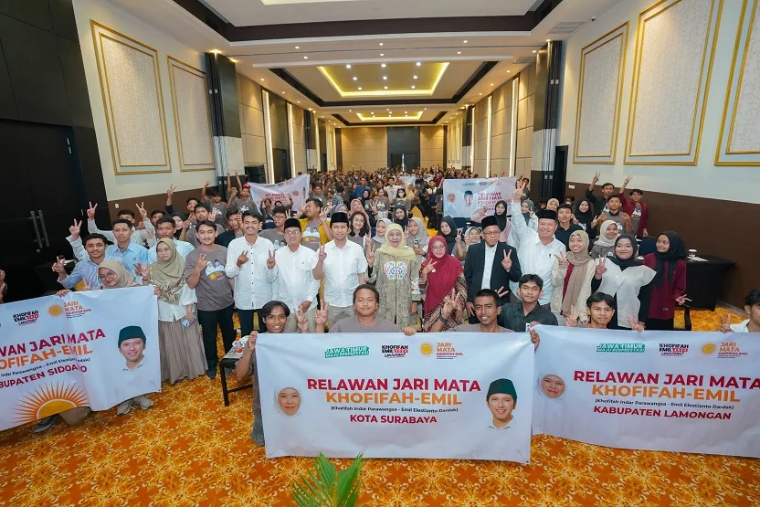 Terbaru, para pemuda Muhammadiyah yang tergabung dalam Jaringan Relawan Matahari (Jarimata) menyatakan dukungan untuk Khofifah-Emil di Hotel Surabaya Suite Hotel, Jumat (22/11/2024).
