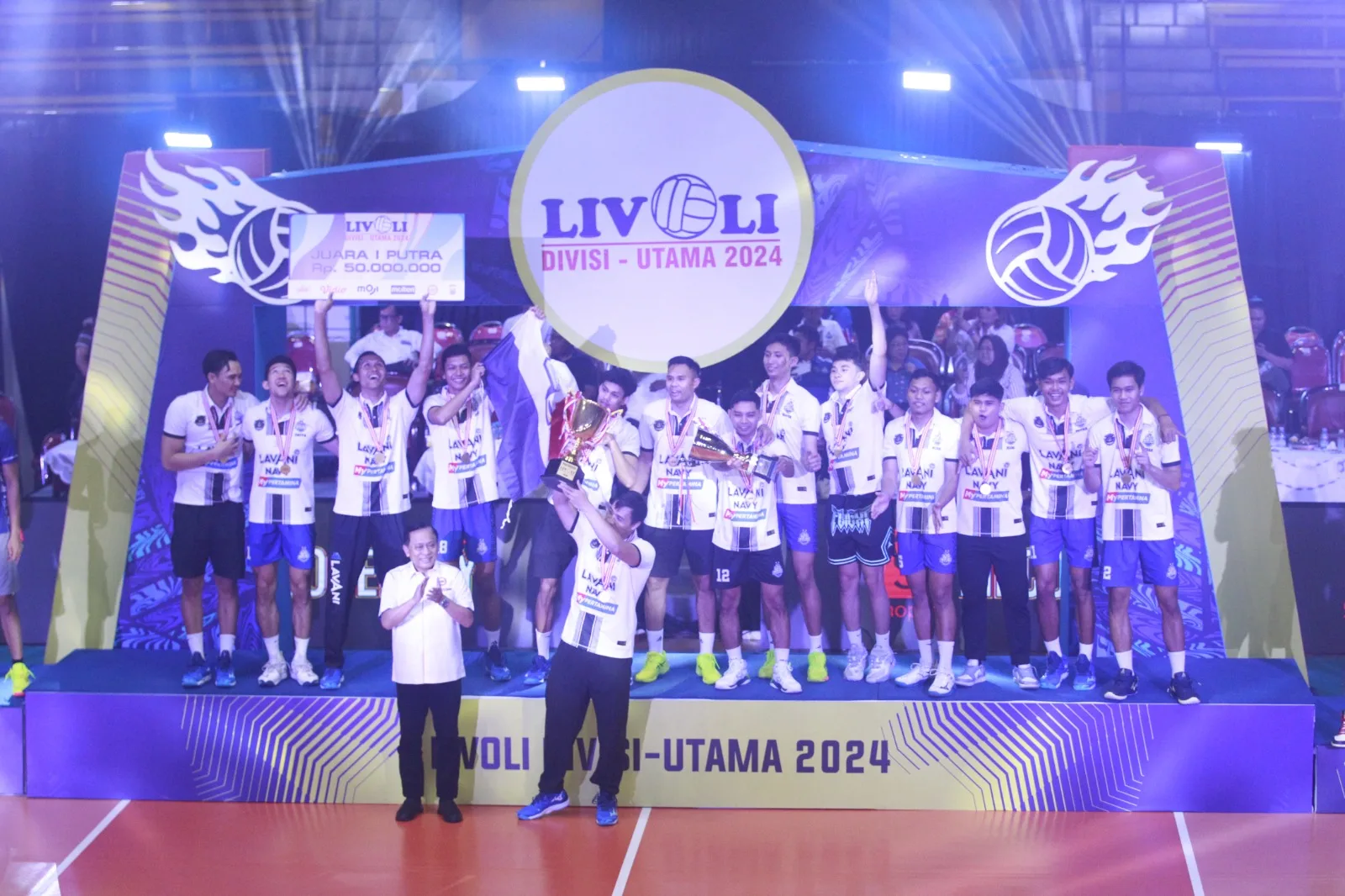 GRESIK-KEMPALAN : Tim putra LavAni Navy meraih gelar juara Livoli Divisi Utama,2024, usai memenangi laga final atas Indomaret Sidoarjo dengan skor 3-2 (23-25, 21-25, 25-16, 25-21, 20-18) di GOR Tri Dharma Petrokimia Gresik, Sabtu (23/11/2024) malam.