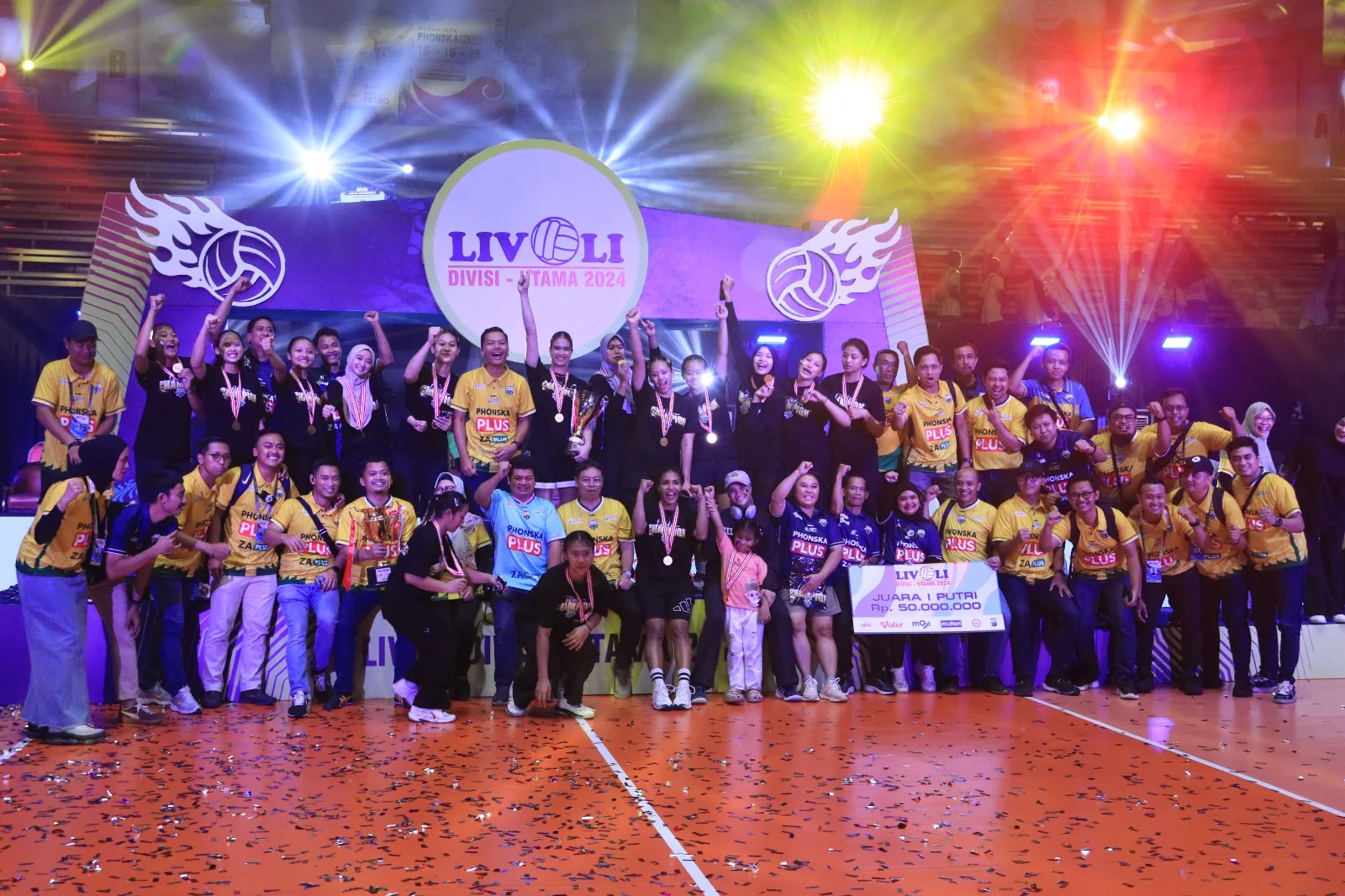 GRESIK-KEMPALAN: Tim putri Petrokimia Gresik Pupuk Indonesia sukses mempertahankan gelar juara usai membekuk TNI AL dengan skor 3-0 (25-19, 25-19, 25-17) pada grand final Kompetisi Voli Antarklub Livoli Divisi Utama 2024 di GOR Tri Dharma Petrokimia Gresik, Jumat (22/11/2024) malam.