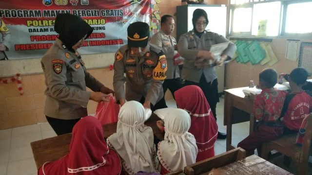 SIDOARJO-KEMPALAN: Polsek Buduran Polresta Sidoarjo bersama stake holder terkait melaksanakan program prioritas pemerintah pusat, yakni pembagian makan siang bergizi bagi pelajar di sekolah wilayah terpencil. Yakni Dusun Kepetingan, Desa Sawohan, Kecamatan Buduran, Kabupaten Sidoarjo.