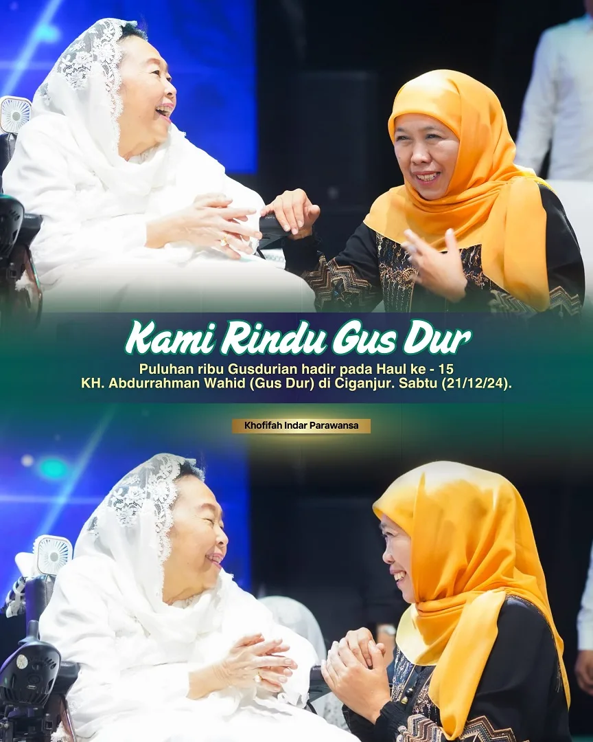 Haul Gus Dur ke-15 ini menjadi momentum penting untuk mengingat kembali nilai-nilai perjuangan yang telah diwariskan oleh almarhum. Karenanya Khofifah mengajak seluruh masyarakat untuk dapat melanjutkan semangat Gus Dur dalam membangun bangsa yang adil, toleran, dan penuh kasih.