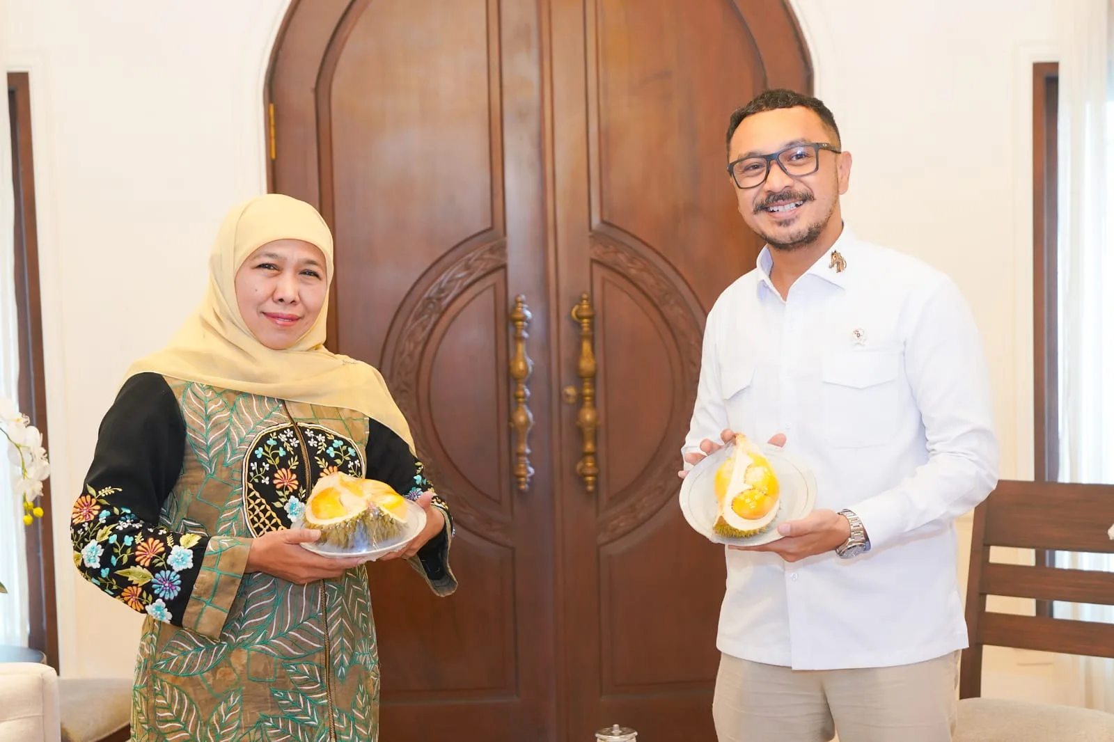 Dalam kesempatan ini, Khofifah menyambut kedatangan Wamen Giring dengan sangat hangat dengan menyuguhkan durian Black Thorn asal Srengat Blitar.