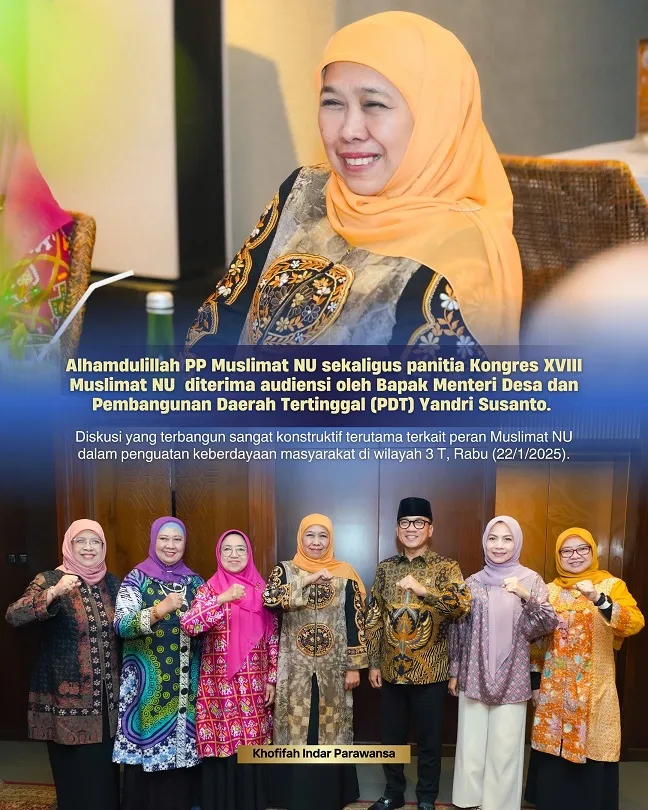 “Alhamdulillah kami tim.PP Muslimat NU sekaligus panitia Kongres XVIII Muslimat NU diterima audiensi oleh Bapak Menteri Desa dan Pembangunan Daerah Tertinggal (PDT) Yandri Susanto. Diskusi yang terbangun sangat konstruktif terutama terkait peran Muslimat NU dalam penguatan keberdayaan masyarakat di wilayah 3 T,” kata Khofifah di Jakarta, Kamis (23/1/2025).