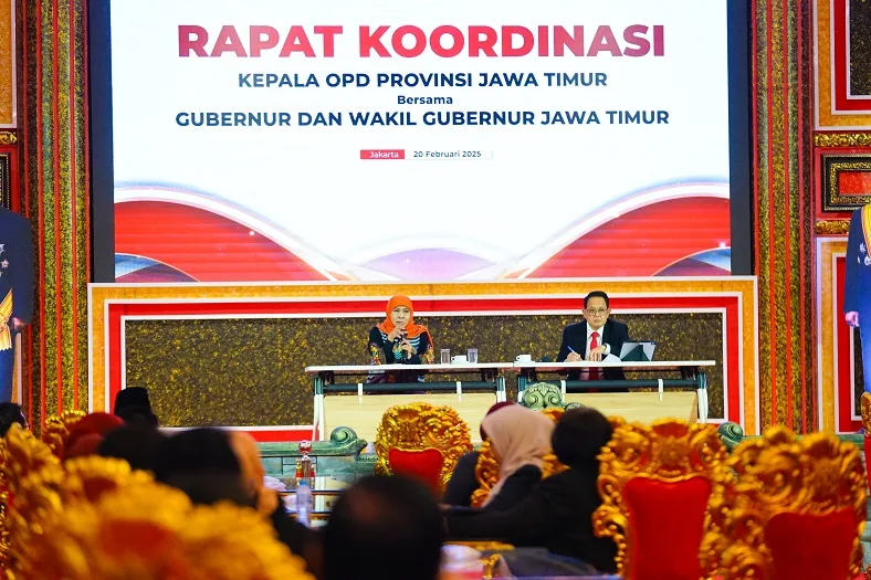 JAKARTA-Gubernur Jawa Timur Khofifah Indar Parawansa usai dilantik langsung tancap gas menggelar rapat koordinasi bersama jajaran kepala OPD Pemprov Jatim di Kraton Majapahit Jakarta, Kamis (20/2/2025) .