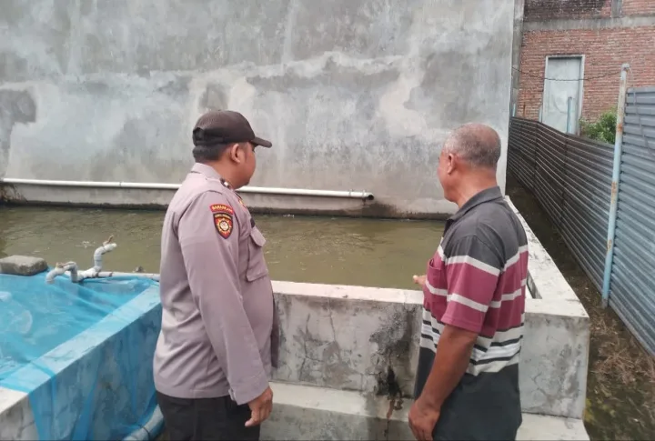 SIDOARJO-KEMPALAN: Bhabinkamtibmas Desa Kelopo Sepuluh, Polsek Sukodono, Polresta Sidoarjo, Aipda M. Yafie melaksanakan pengecekan ikan lele, pada Minggu (11/5/2025).