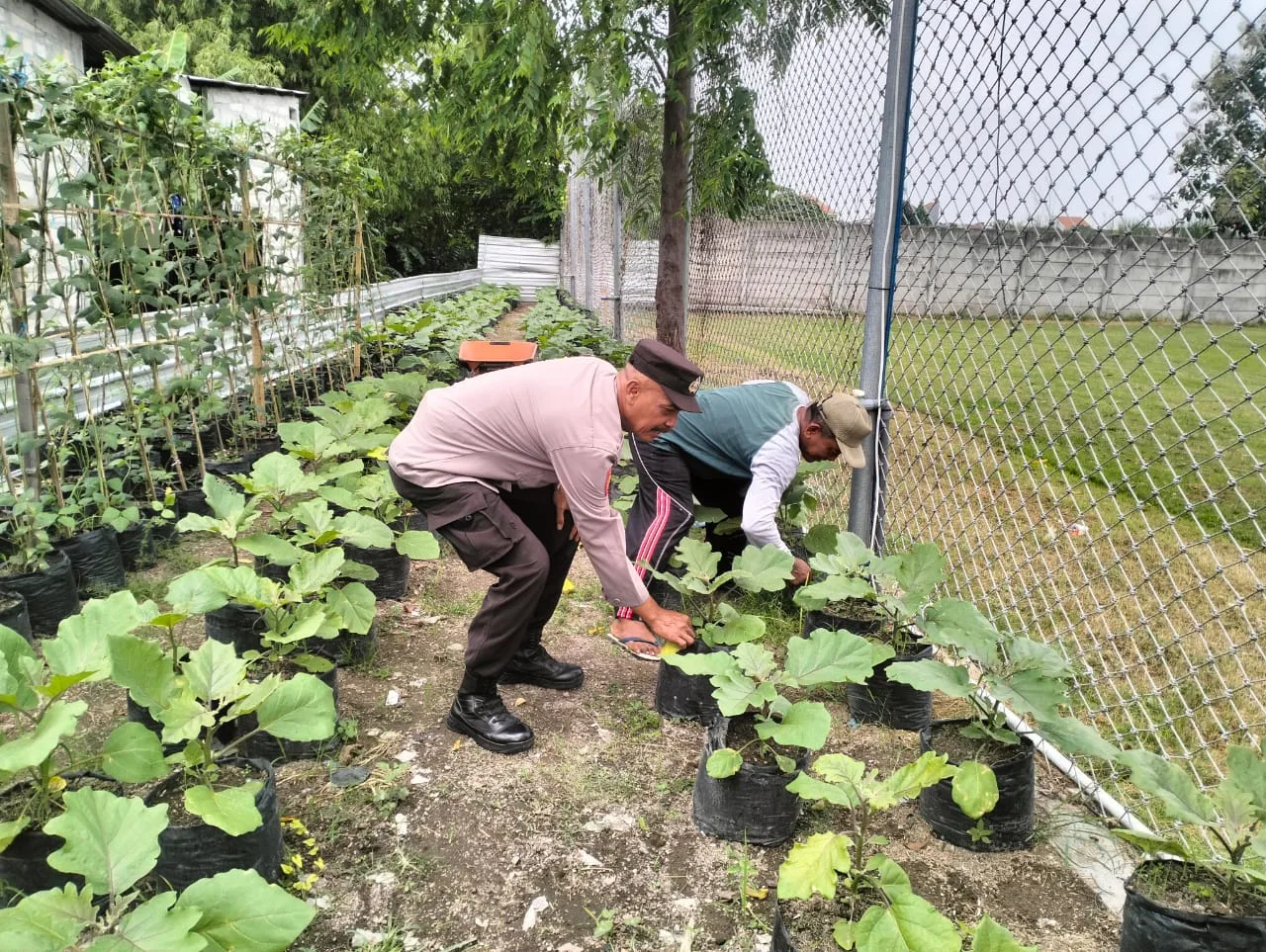 SIDOARJO-KEMPALAN: Bhabinkamtibmas Polsek Wonoayu Polresta Sidoarjo Aiptu Djoko Nopyadi melakukan pengecekan langsung ke lahan tanaman sawi milik warga binaan di Desa Simoketawang, Kecamatan Wonoayu, Kabupaten Sidoarjo, Senin (19/5/2025). Hal ini sebagai upaya mendukung ketahanan pangan nasional sebagaimana tertuang dalam Program Asta Cita Presiden Prabowo Subianto serta arahan dari Kapolresta Sidoarjo Kombes Pol. Christian Tobing.