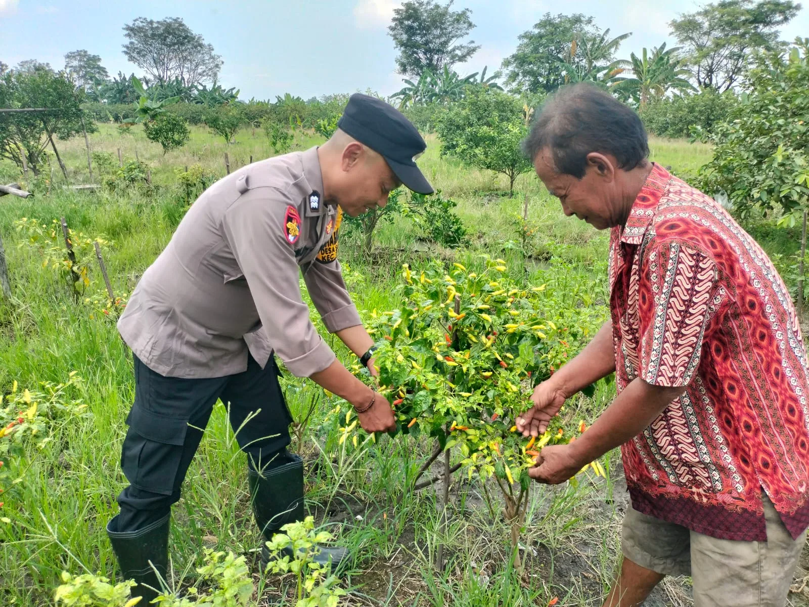 SIDOARJO-KEMPALAN: Mendukung program ketahanan pangan dan pemanfaatan lahan pekarangan secara produktif, Polsek Taman Polresta Sidoarjo melalui Bhabinkamtibmas Desa Sambibulu, Aiptu Choirul Wahyudi, melaksanakan pengecekan tanaman hortikultura milik warga di Dusun Sambisari dan Sambiroto, Desa Sambibulu, Kecamatan Taman, Sidoarjo, Selasa pagi (20/5/2025).