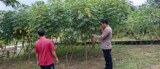 SIDOARJO-KEMPALAN: Guna mendukung program ketahanan pangan yang diinisiasi Polresta Sidoarjo, Anggota Polsek Wonoayu Polresta Sidoarjo Aiptu Ari Susanto melaksanakan kegiatan patroli sambang ke warga Desa Simoketawang yang memanfaatkan lahan kosong untuk budidaya ikan lele, Rabu (25/6/2025).