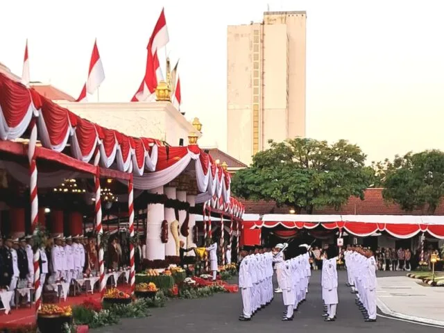 SURABAYA-KEMPALAN: Jika biasanya penurunan bendera berlangsung lebih sepi dibanding pengibaran, lain halnya di Gedung Negara Grahadi, Surabaya, Minggu (17/8) sore. Ribuan warga memenuhi halaman Grahadi untuk menyaksikan prosesi penurunan bendera HUT ke-80 RI yang tetap berjalan meriah.