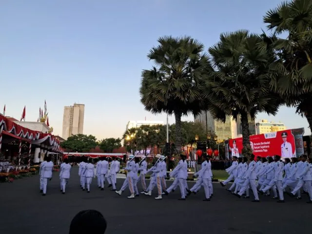 Antusiasme warga sudah terlihat sejak pagi tadi. Pun di sore harinya, bahkan banyak keluarga yang datang membawa anak. Mereka bercampur dengan ASN, veteran, hingga komunitas umum yang memenuhi sisi halaman Grahadi.