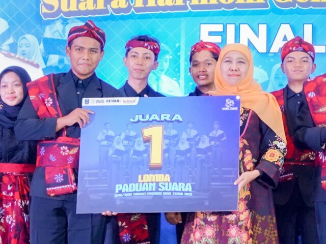 SURABAYA-KEMPALAN: Gubernur Jawa Timur Khofifah Indar Parawansa memberikan apresiasi tinggi kepada seluruh peserta Final Lomba Paduan Suara SMA/SMK Tingkat Provinsi Jawa Timur Tahun 2025 bertajuk “Suara Harmoni Generasi Emas Jawa Timur” yang digelar di Asrama Haji Sukolilo Surabaya, Jumat (10/10).