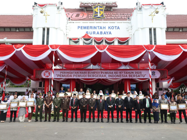 SURABAYA-KEMPALAN: Pemkot Surabaya menggelar upacara peringatan Hari Sumpah Pemuda ke-97 dengan khidmat di halaman Balai Kota Surabaya, Selasa (28/10/2025). Dalam momen istimewa ini, Pemkot Surabaya turut memberikan apresiasi kepada 68 pemuda-pemudi berprestasi yang telah mengharumkan nama Kota Pahlawan di berbagai bidang.