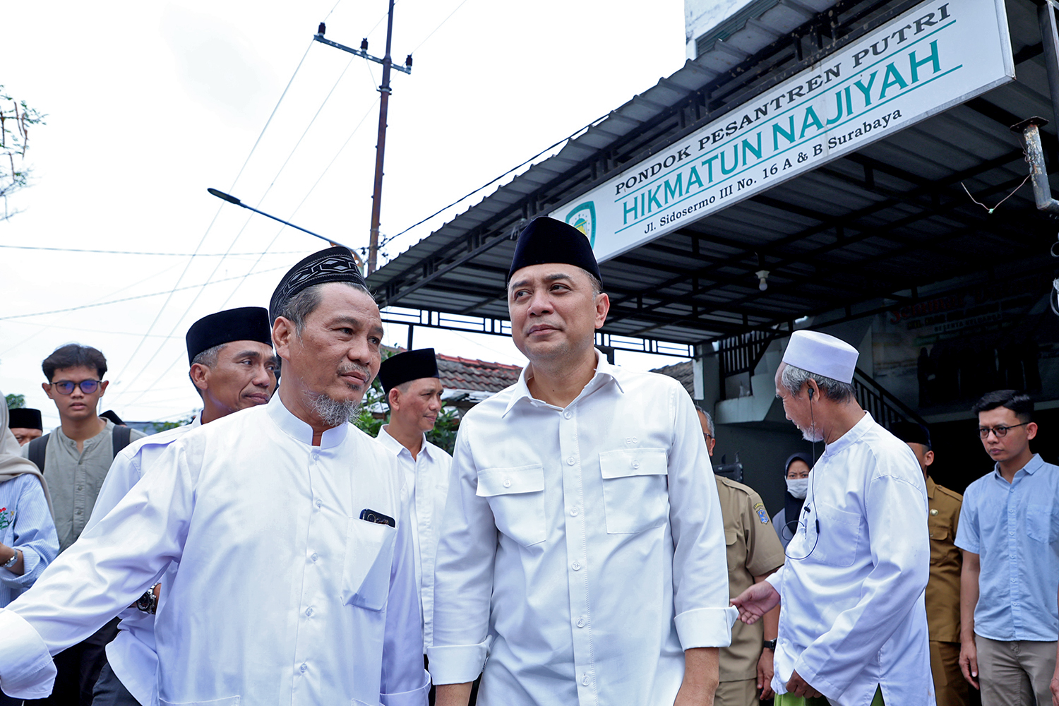 SURABAYA-KEMPALAN: Wali Kota Surabaya Eri Cahyadi melakukan kunjungan ke Pondok Pesantren (Ponpes) Hikmatun Najiyah yang berada di Jalan Sidosermo (Sidoresmo) III No 16 A dan B, Senin (27/10).