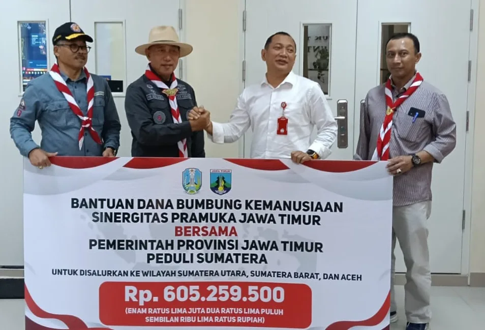 SURABAYA-KEMPALAN: Kwartir Daerah (Kwarda) Gerakan Pramuka Jawa Timur menyalurkan bantuan uang sebesar Rp605.259.500 untuk korban bencana banjir Aceh, Sumatra Utara, dan Sumatra Barat.