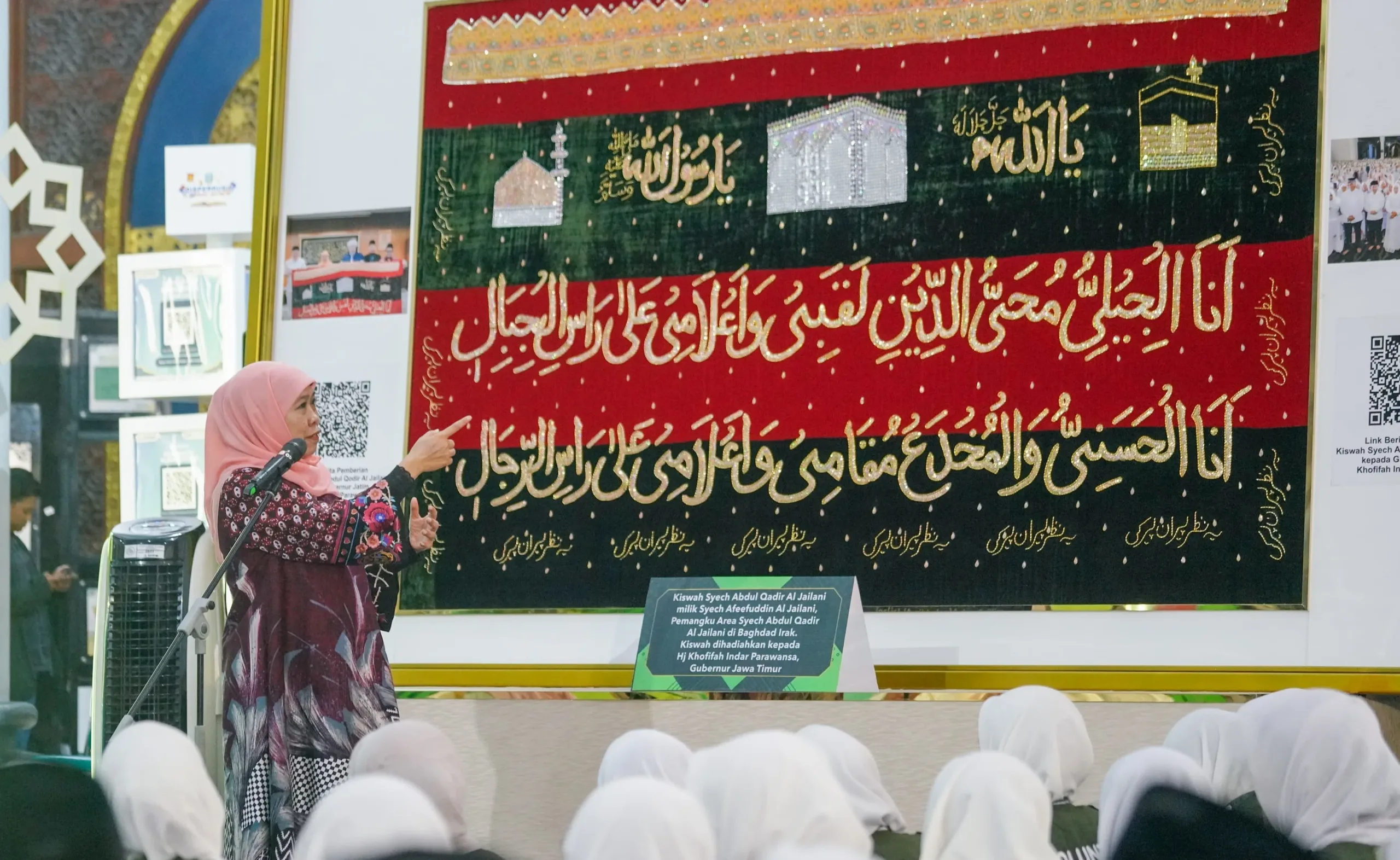 SURABAYA-KEMPALAN: Gubernur Jawa Timur Khofifah Indar Parawansa membuka Pameran Kiswah Syekh Abdul Qadir Al Jailani di Masjid Nasional Al Akbar Surabaya, Rabu (11/3) malam.
