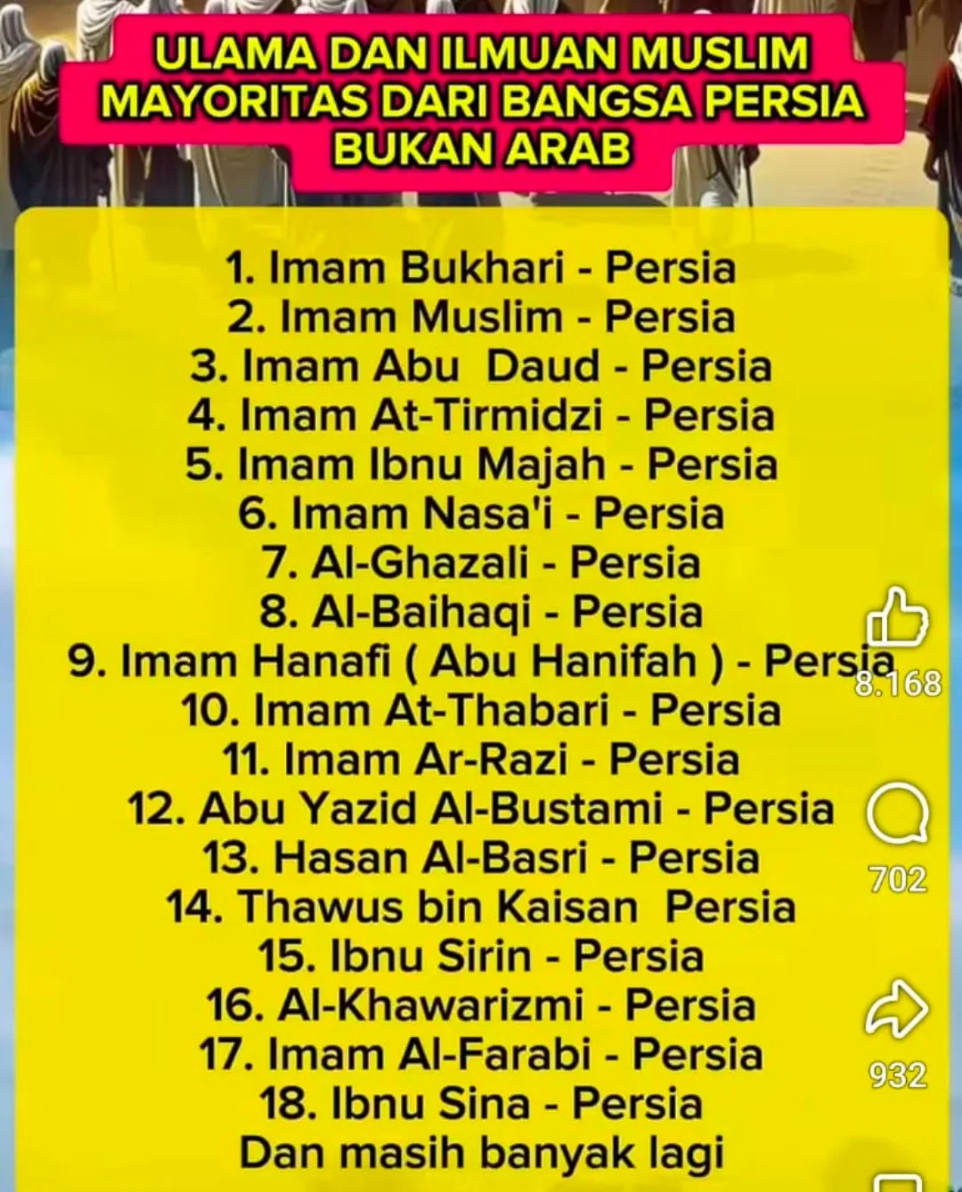 SURABAYA-KEMPALAN: Belakangan ini beredar sebuah foto yang memuat daftar nama ulama dan ilmuwan Muslim dengan klaim bahwa semua orang yang tercantum mayoritas berasal dari Persia, bukan Arab. Sehingga menyiratkan bangsa Arab tidak memiliki kontribusi yang signifikan dalam ilmu agama dan ilmu pengetahuan. Padahal informasi seperti ini tidak sepenuhnya benar dan bisa menyesatkan, terlebih lagi Rasulullah Muhammad SAW sendiri adalah orang Arab dari suku Quraisy, yang menjadi utusan Allah dan sumber utama ajaran Islam yang kita anut hingga saat ini.