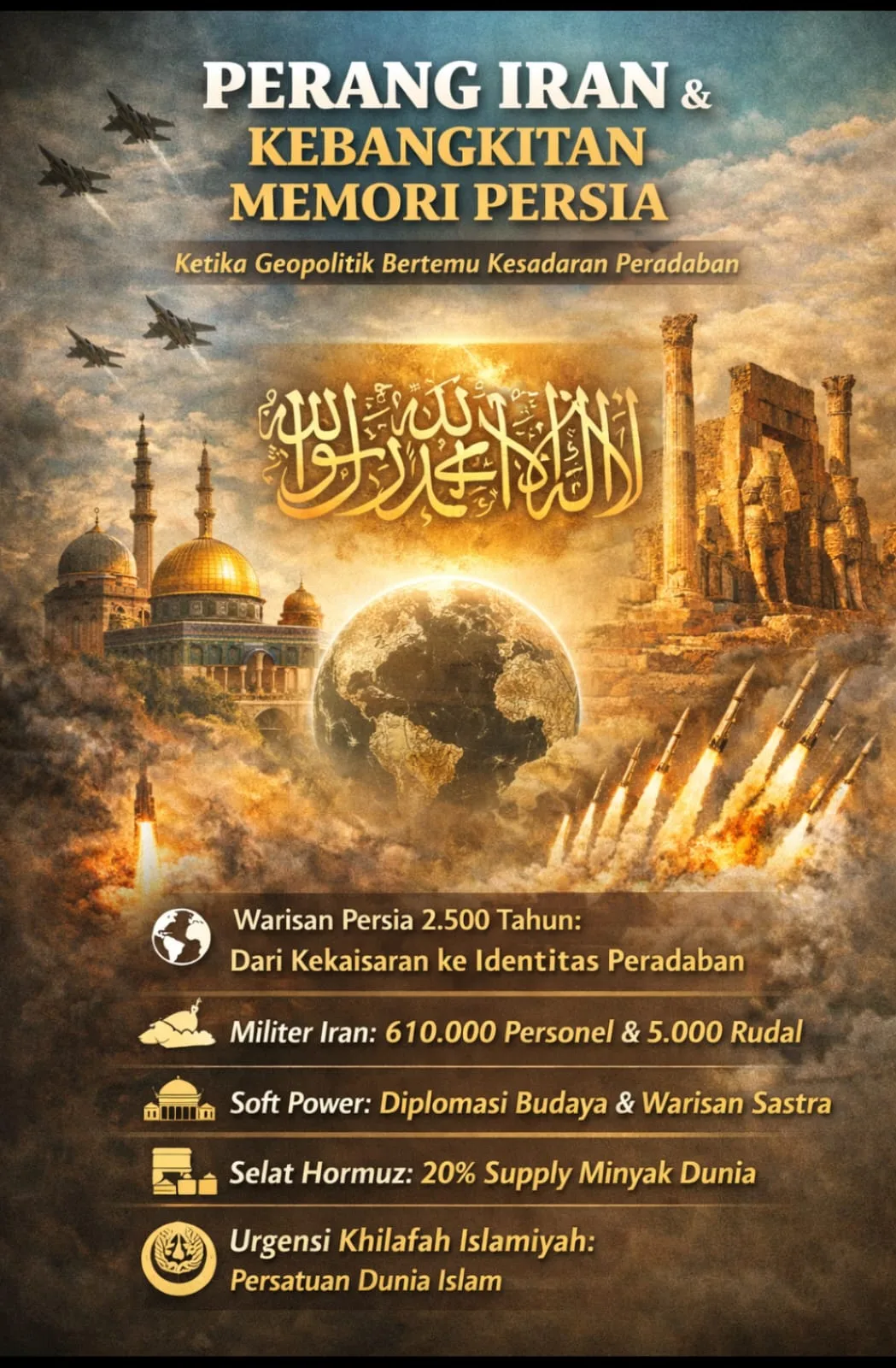 KEMPALAN: Perang yang melibatkan Iran dalam lanskap geopolitik mutakhir tidak lagi dapat dibaca semata sebagai konflik militer konvensional. Ia telah bergerak melampaui dimensi negara-bangsa (state) menuju wilayah yang lebih dalam: pertarungan antara kekuatan geopolitik modern dengan kesadaran historis sebuah peradaban tua. Di titik inilah, Iran tampil bukan hanya sebagai aktor negara, tetapi sebagai entitas peradaban yang membawa memori panjang Persia ke dalam arena konflik kontemporer.