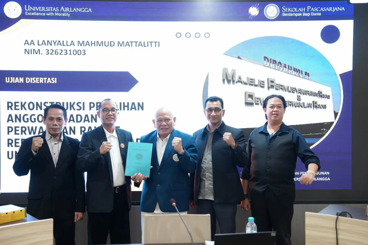 Ujian Disertasi tahap 1 ini berjudul “Rekonstruksi Pemilihan Anggota Perwakilan Rakyat dari Unsur Non Partai Politik (Independen)” ini berlangsung di Sekolah Pascasarjana Universitas Airlangga Surabaya, Selasa (28/4/2026).