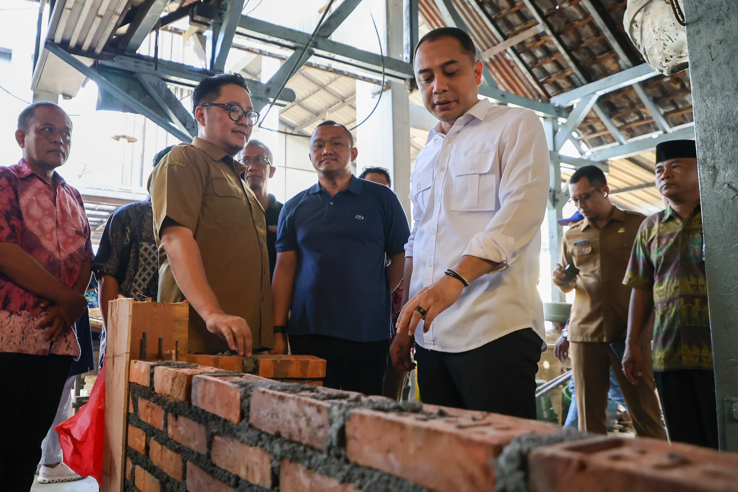 Wali Kota Surabaya Eri Cahyadi meninjau langsung proses revitalisasi Pasar Tembok Dukuh Surabaya, Selasa (28/4).