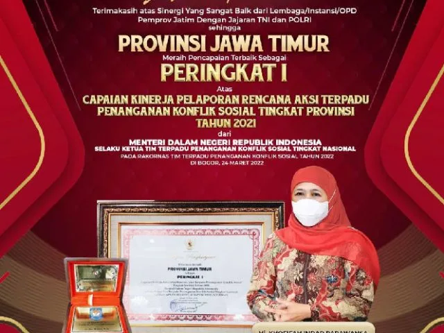 Tiga Tahun Berturut-Turut, Jawa Timur Raih Penghargaan Terbaik Pelaporan Aksi Terpadu Penanganan Konflik Sosial